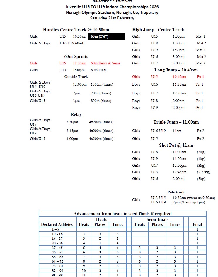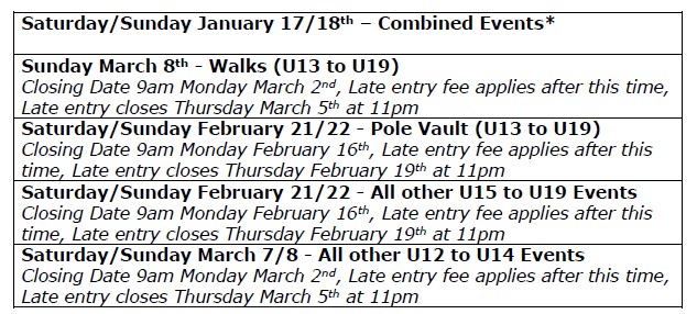 Munster indoor track and field events will begin on February 21st and 22nd, for U15-U19 age groups (Born 2012 is U15, born 2008 is U19). Competition for U12-14 (born 2015-2013) will take place on the weekend of March 7th and 8th.